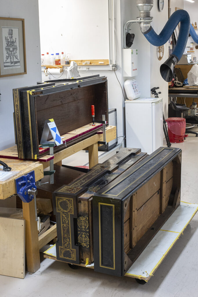 De nouvelles campagne d’études sont actuellement menées sur des oeuvres mobilières produites par l’atelier d’André-Charles Boulle, conservées dans les collections muséales du Département des Objets d’Art du Louvre, au Musée National des Châteaux de Versailles et Trianon, à l’abbaye Royale de Chaalis, ou dans des collections privées.